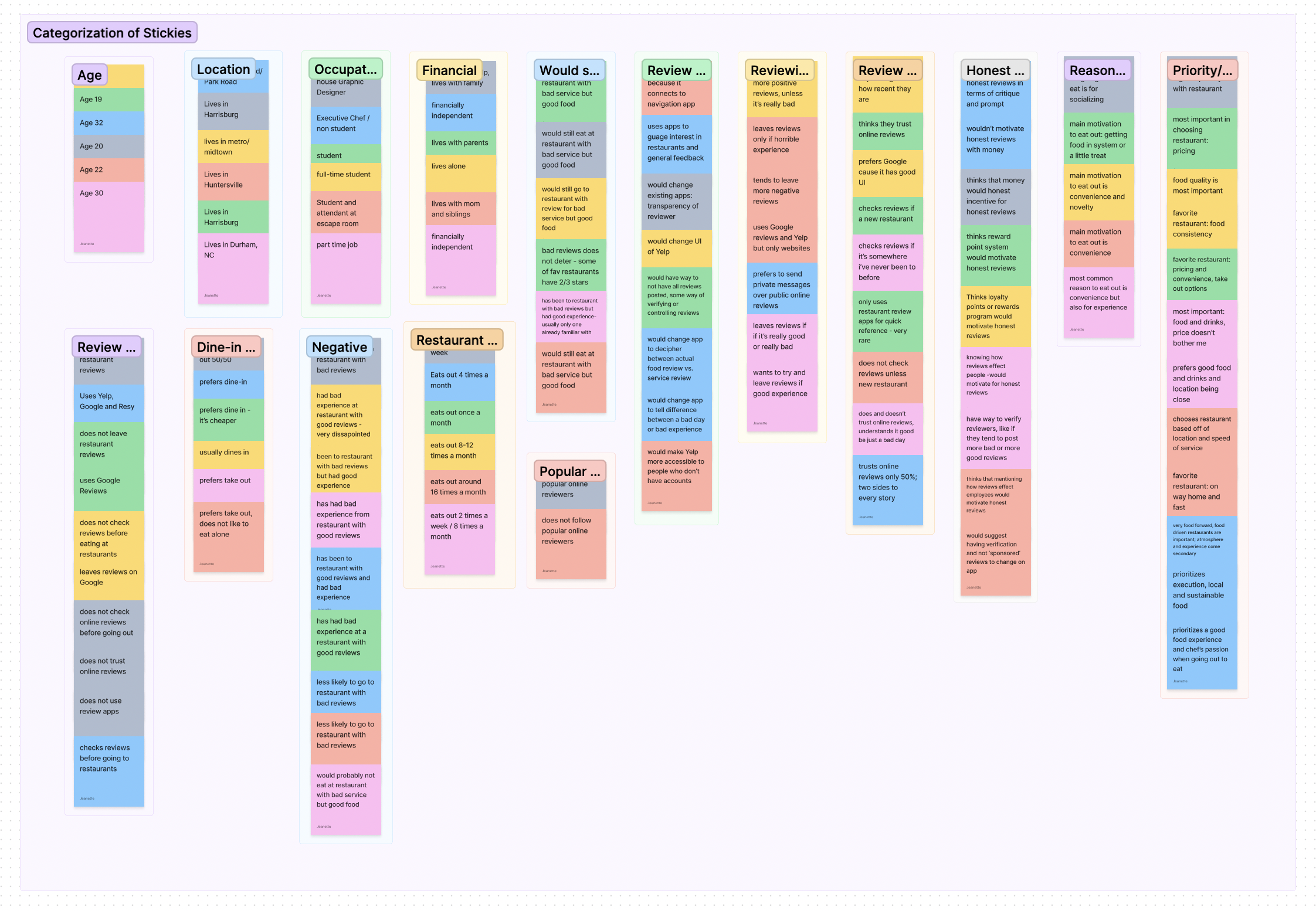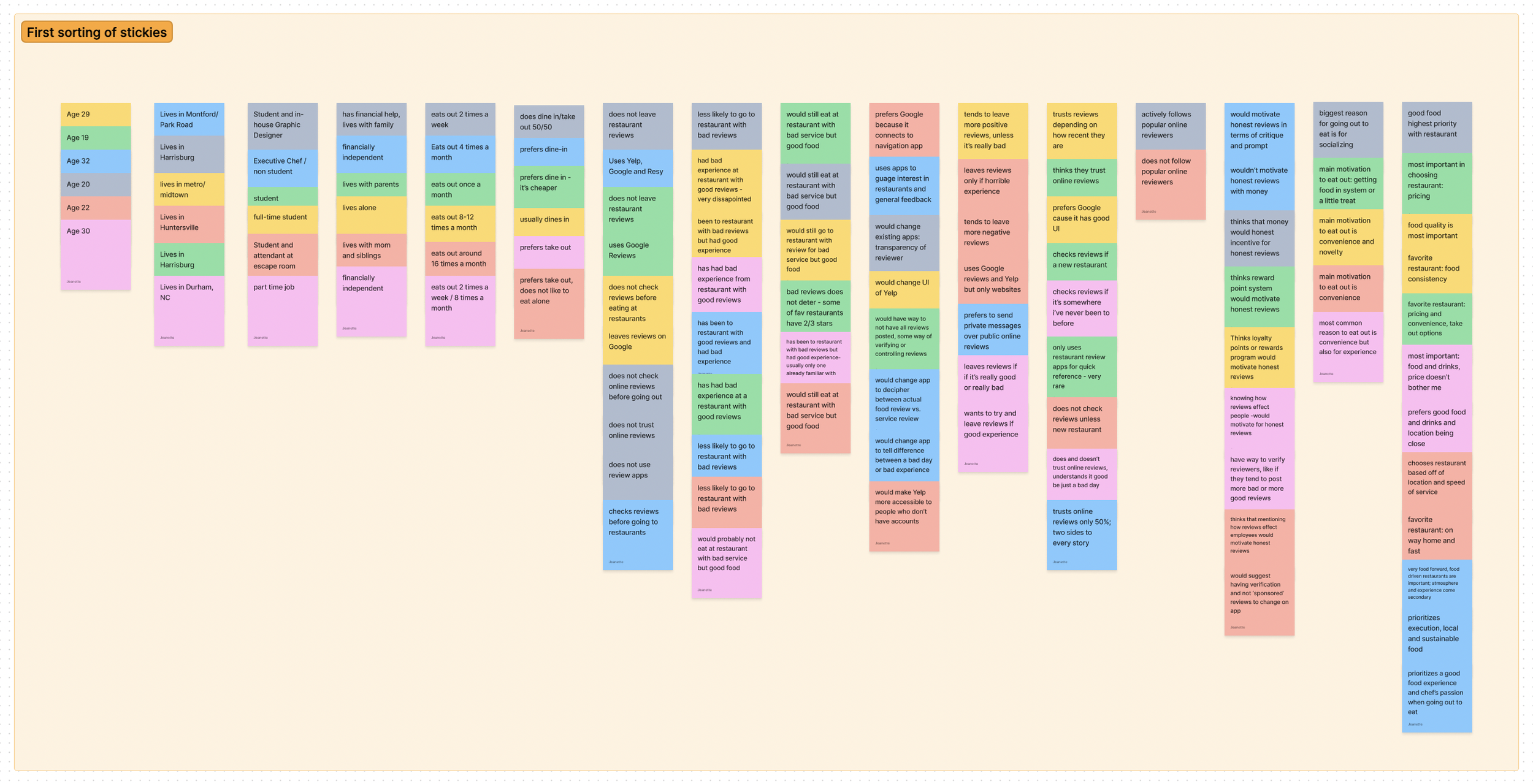 Outcome: I realized through this sorting that all the user interviews had the same results in one section. Everyone said that they didn’t go to restaurants with bad reviews, but they also did not trust online reviews.